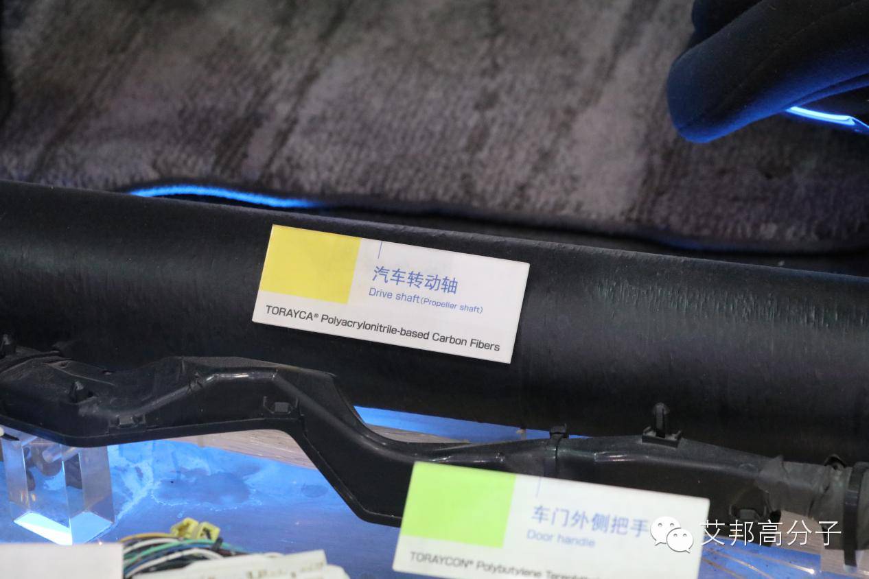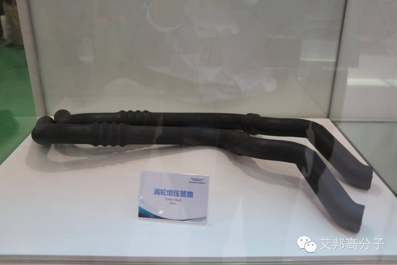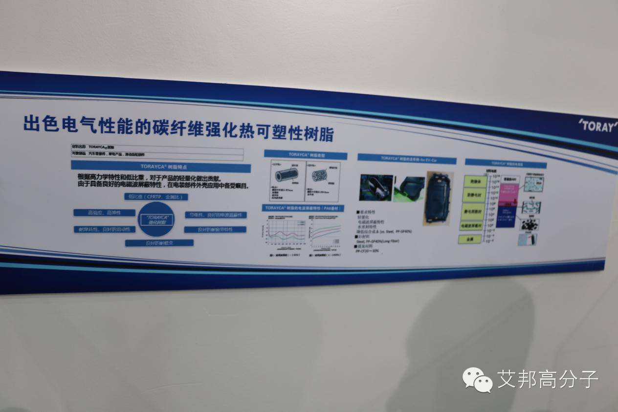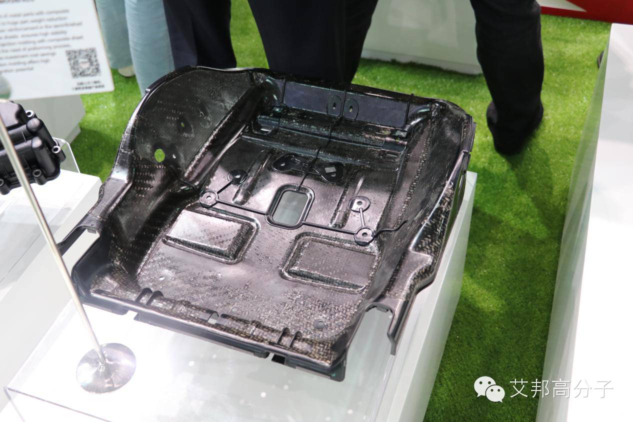 众所周知,东丽碳纤维的名头可是响当当的。不出所料,东丽在今年的橡塑展也是一如既往地主推汽车碳纤维材料。除此之外,东丽也推出了一款用在汽车引擎冷却系统上的PPS,在耐热循环性和尺寸稳定上更加出色。另一个亮点则是一款碳纤维复合材料,PP+20~30%制作的电池外壳。